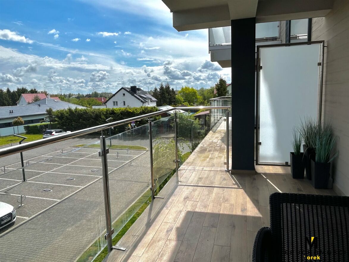 dużego balkonu z ekspozycją wschodnią i widokiem na park oraz parking.